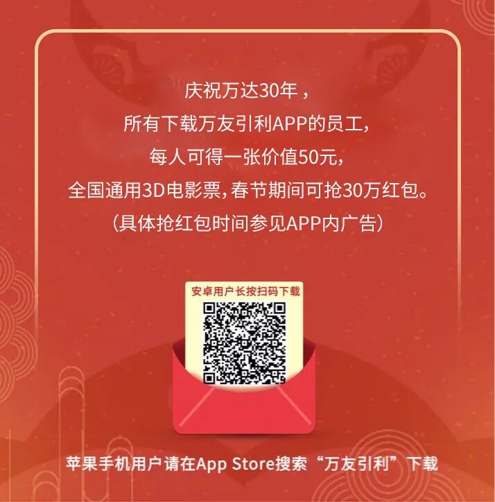 - 万达员工看好了,万友引利APP将在春节期间发送30万元红包雨