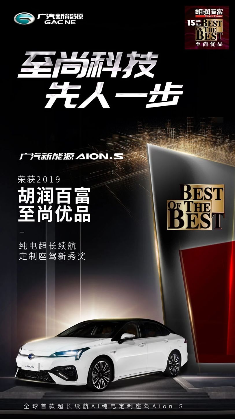 在今年1月胡润百富发布的《2019至尚优品——中国千万富豪品牌倾向报告》中,Aion S荣获“纯电超长续航定制轿跑新秀奖”,成为唯一得奖的中国汽车品牌车型,成为中国高端新能源车的“代言人”。