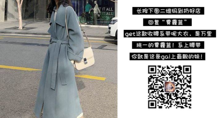 所以,长按下图二维码到“扔好店”,回复“雾霾蓝”,get这款收腰系带呢大衣,是万里挑一的雾霾蓝!系上腰带,你就是这条gai上最靓的妹!