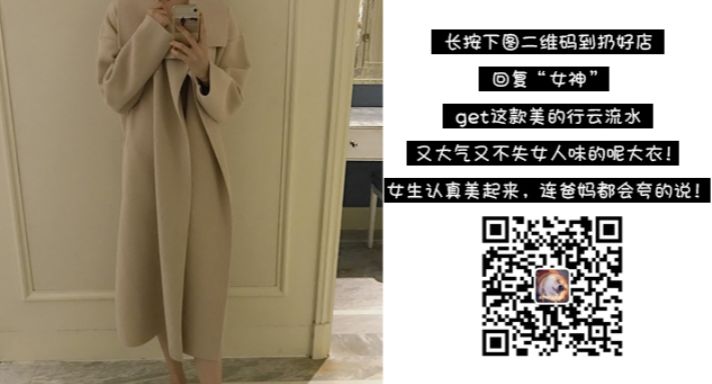 那么,长按下图二维码到“扔好店”,回复“女神”,get这款美的行云流水,又大气又不失女人味的呢大衣!女生认真美起来,连爸妈都会夸的说!
