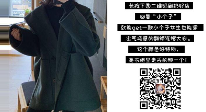 来!长按下图二维码到“扔好店”,回复“小个子”,就能get一款小个子女生也能穿出气场感的翻领连帽大衣。这个颜色好特别,是衣柜里走丢的那一个!