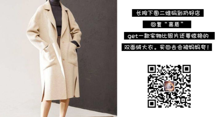 所以,长按下图二维码到“扔好店”,回复“高质”,get一款实物比照片还要惊艳的双面绒大衣。买回去会被妈妈夸!