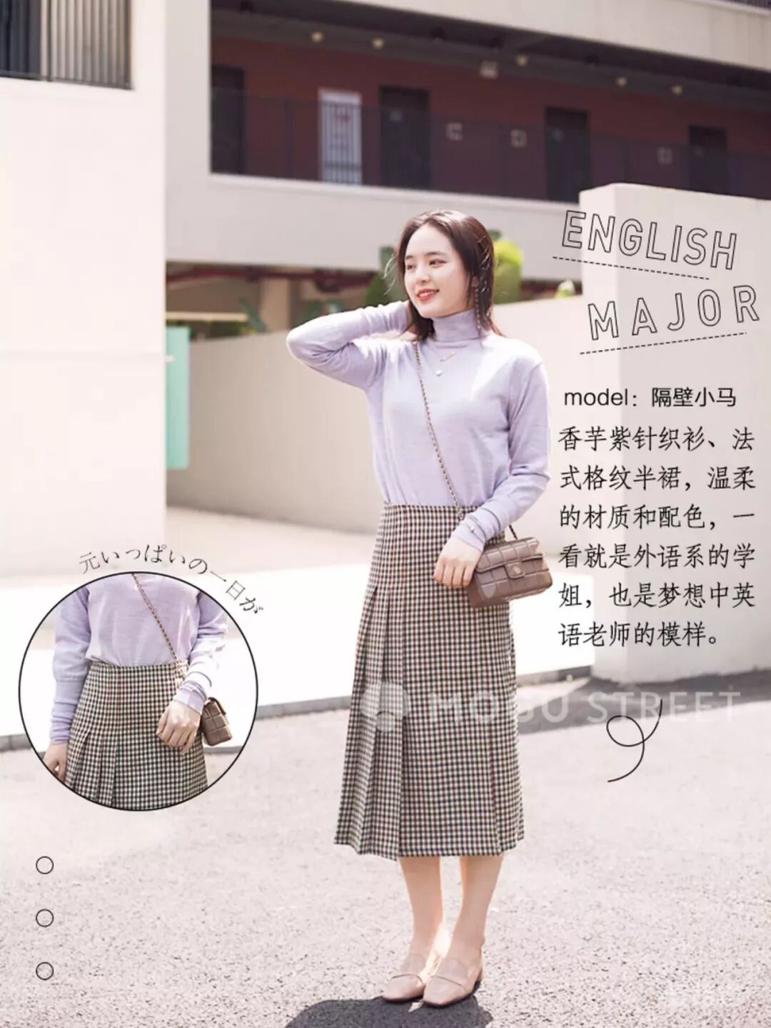 香芋紫色针织衫搭配格纹半身裙,温柔的颜色和材质,是让人心动的外语系小姐姐没错了~