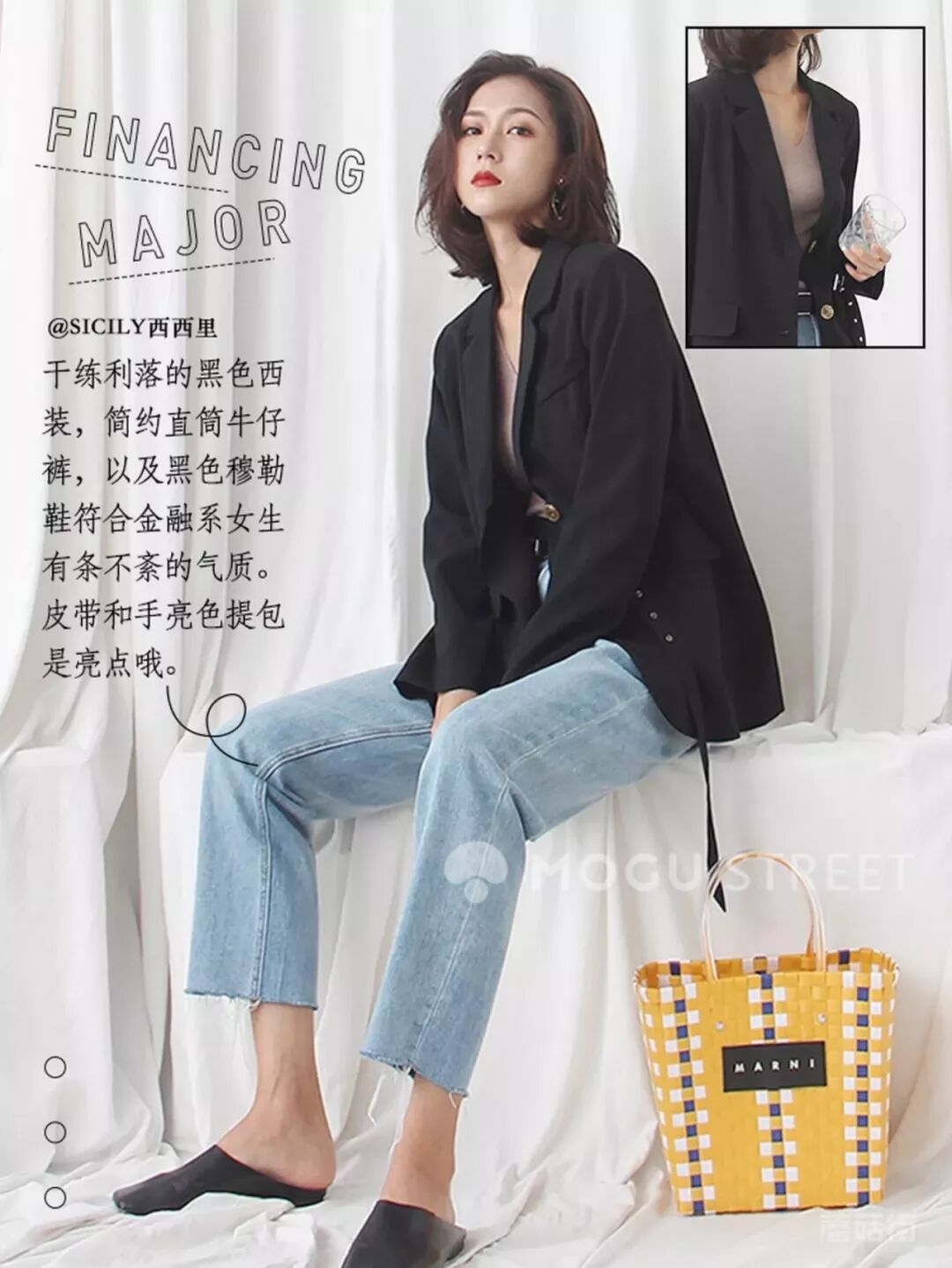 金融系女生给人一种十分专业严谨,利落干练又气场十足的感觉。利落的黑色小西装混搭直筒牛仔裤,简洁大气又不会显得呆板无趣。穆勒鞋和亮色手提包的点缀,使整套look更具时尚感。