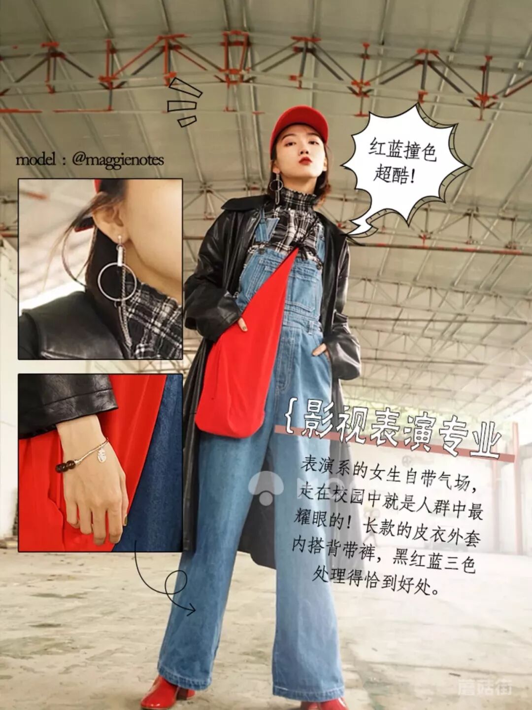 表演系女生习惯了镜头和关注,自带气场走在校园中就是人群中最抢眼的!长款皮衣外套内搭背带裤,红蓝黑配色和抢眼,带着酷酷的不羁感。