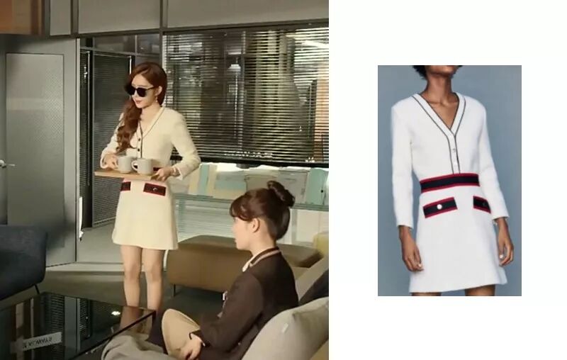 女人最经典的职场装扮莫过于上衣加短裙加外套的组合,当然你也可以学吴秘书进行适当的简化——直接在连衣裙外披一件精致的小西装,裙摆散发柔情,硬领强调气场,简约、干练,行走间充满自信风采。