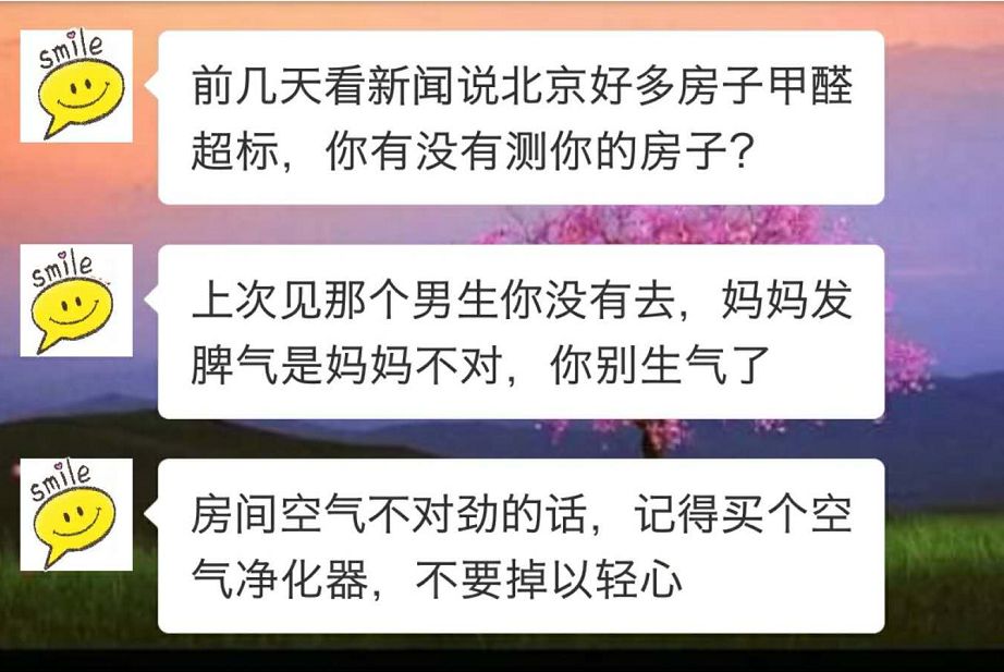 “没超标,空气净化器有,钱够花,工作也没受委屈,不用担心……就说这么多吧。还有,下次相亲我去!”