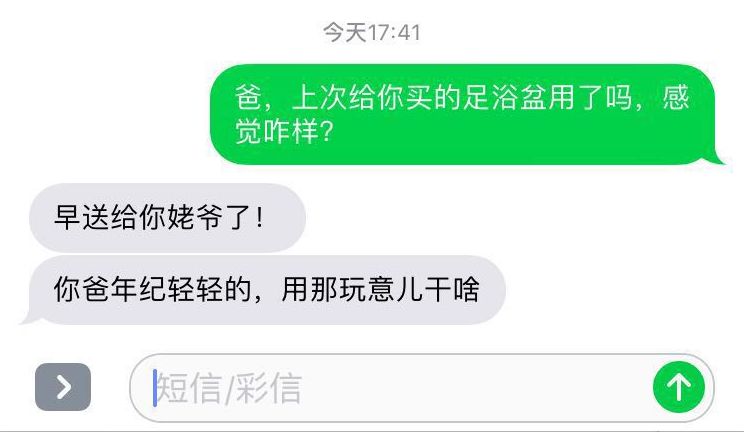 “妈,其实我想直接跟我爸说来着,但不好意思跟他说。给他买了个足浴盆他咋还送给我姥爷了呢,自己老大不小的该服老就服老,都胖成那样了早就步入中年了心里没点儿数儿吗?平时抽烟喝酒的我也劝不住,爱咋地咋地吧,咋安安分分泡个脚也这么难呢?”