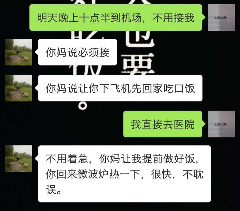 “爸,短信都发了我才想,这么多年第一次直接跟你说落地时间,要不是我妈住院了,我恐怕还是跟她说。我妈这一病,竟然让一辈子不进厨房的你也开始下厨了。爸,说实话,以前没怎么崇拜过你,这是我第一次觉得你还挺厉害的。”