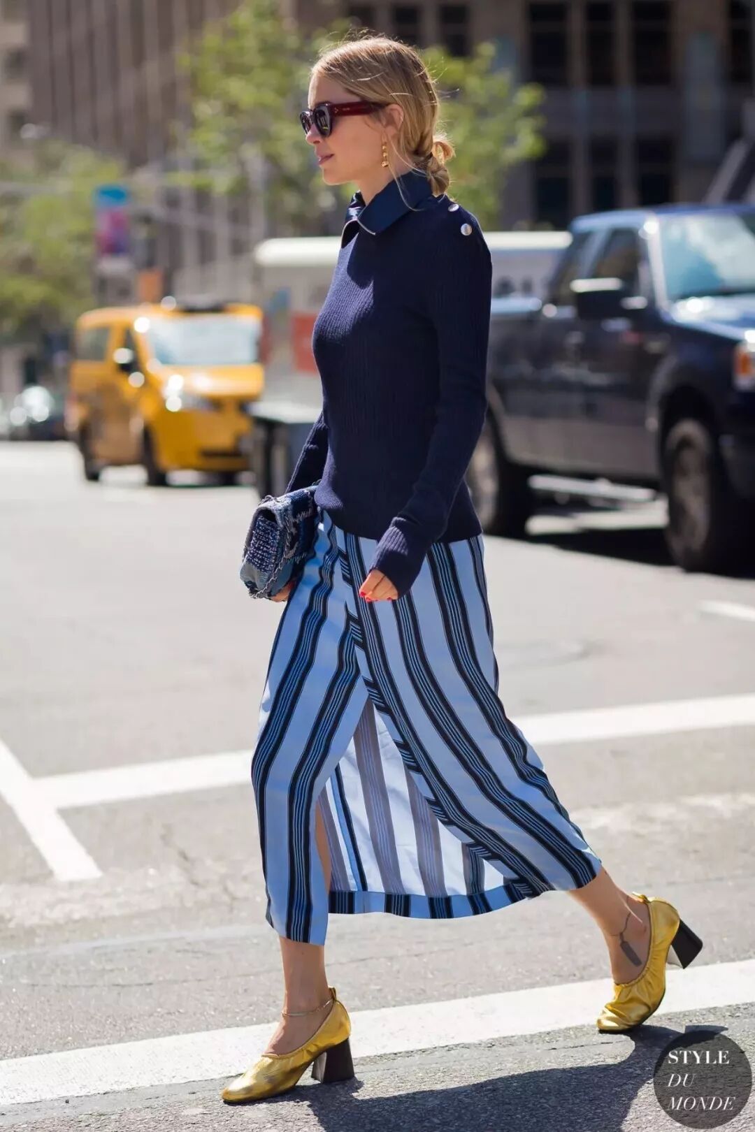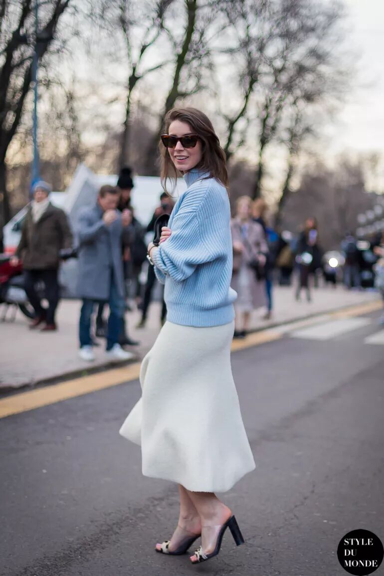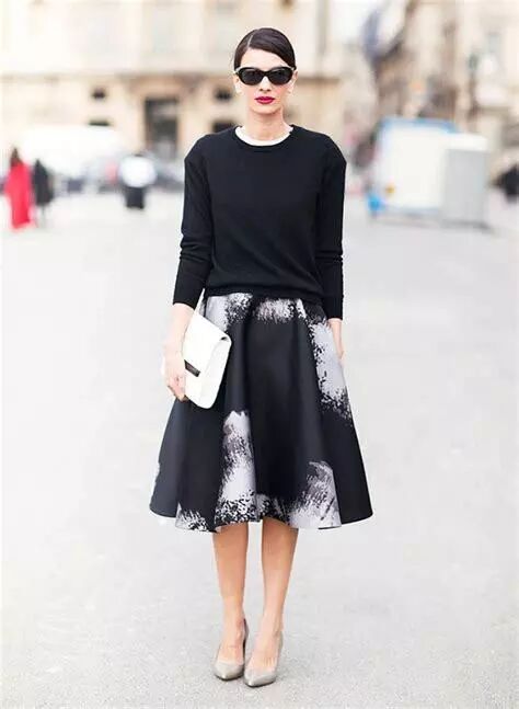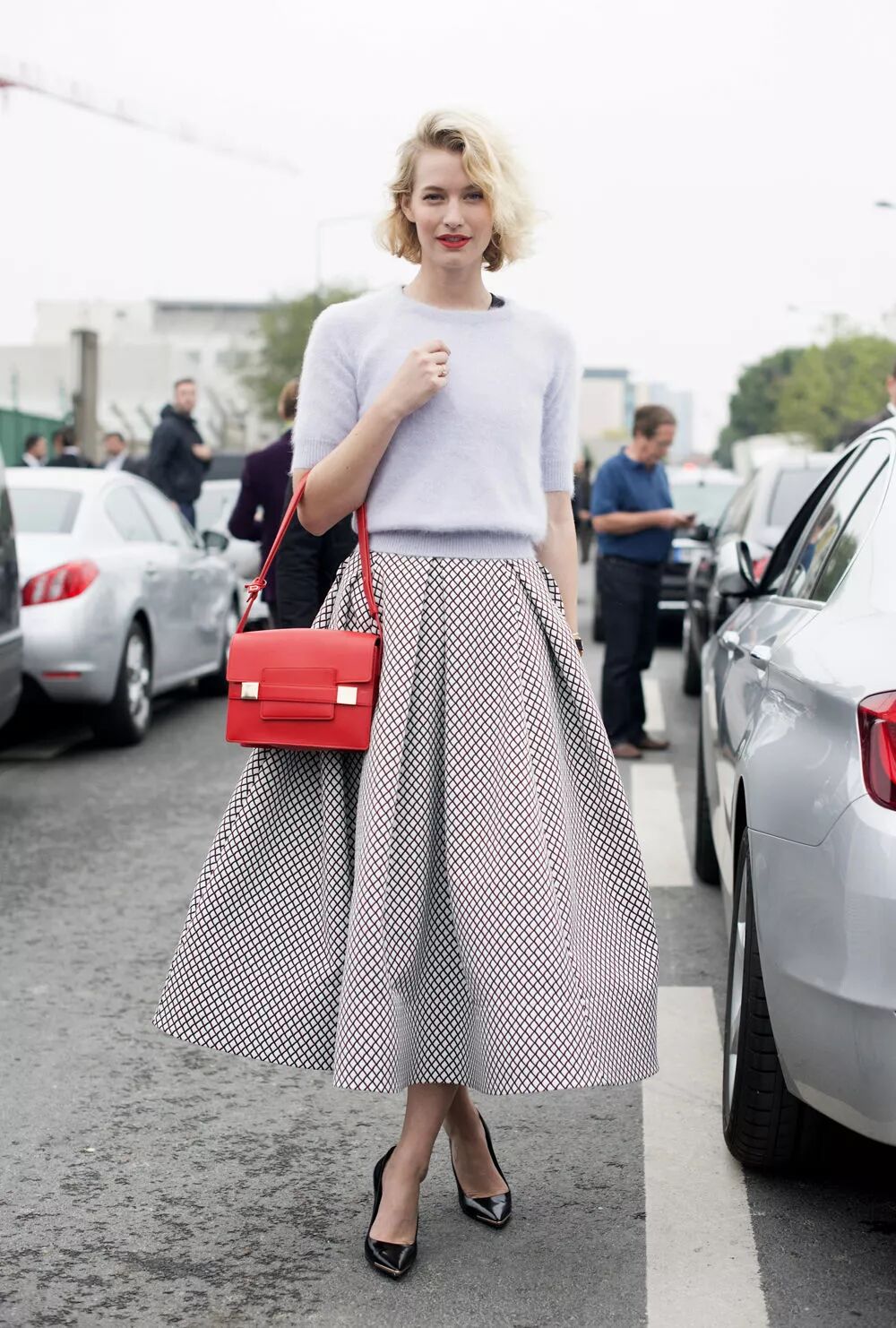 比如优雅经典的迷笛裙,长度和较为厚实的材质对于凉凉的秋天来说,都很好。上衣搭配上不建议宽松毛衣了,短打修身的针织衫会更配。