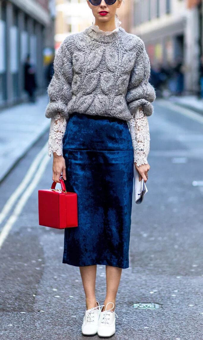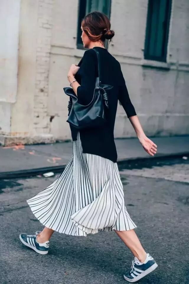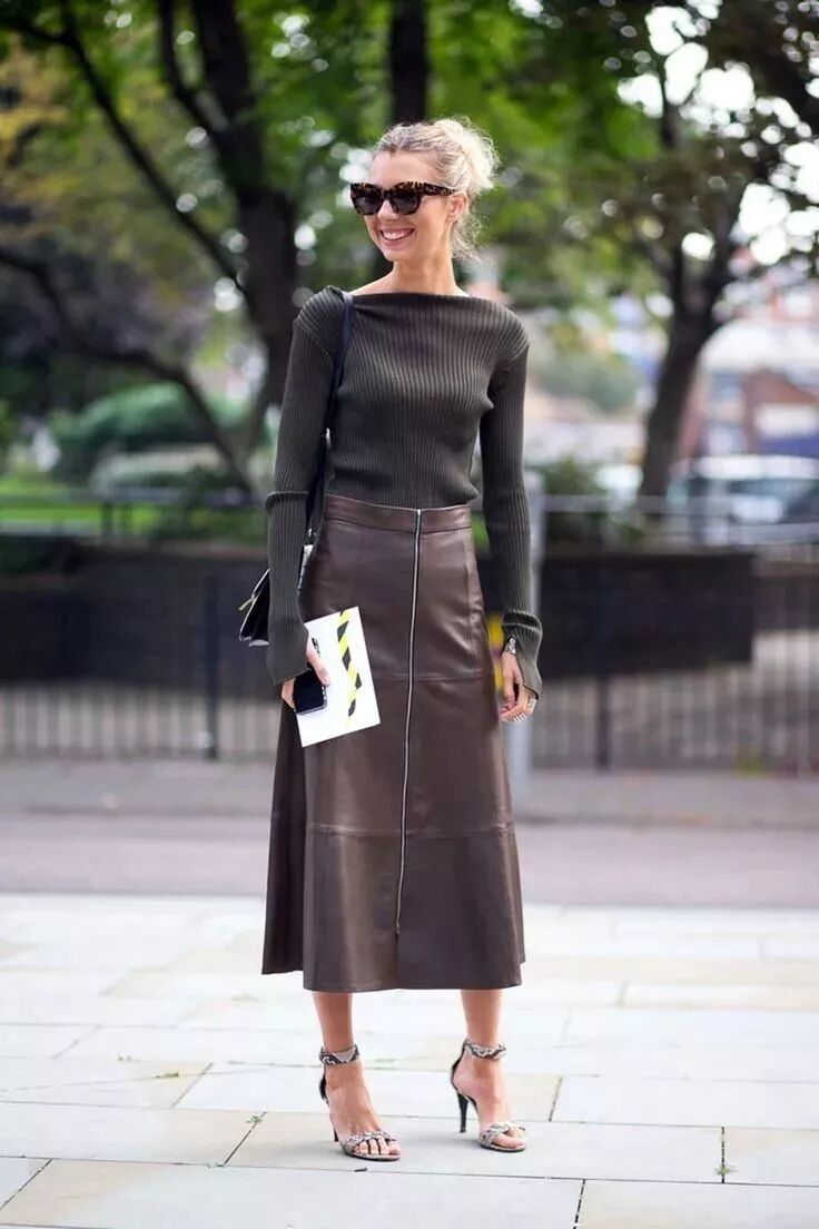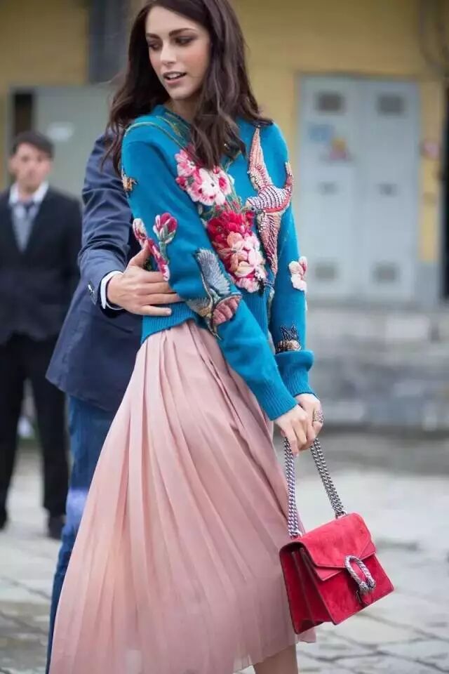 看完前面的短裙,可能略略有点觉得腿冷,其实当天气越往深秋走的时候,还有很多材质的中长裙可以与毛衣搭起来。