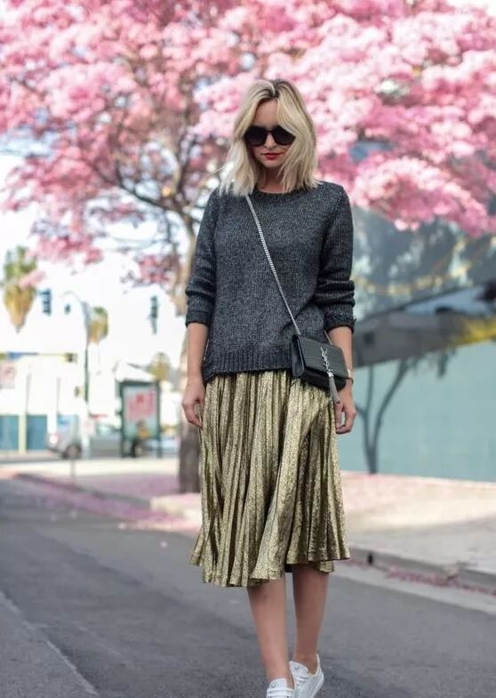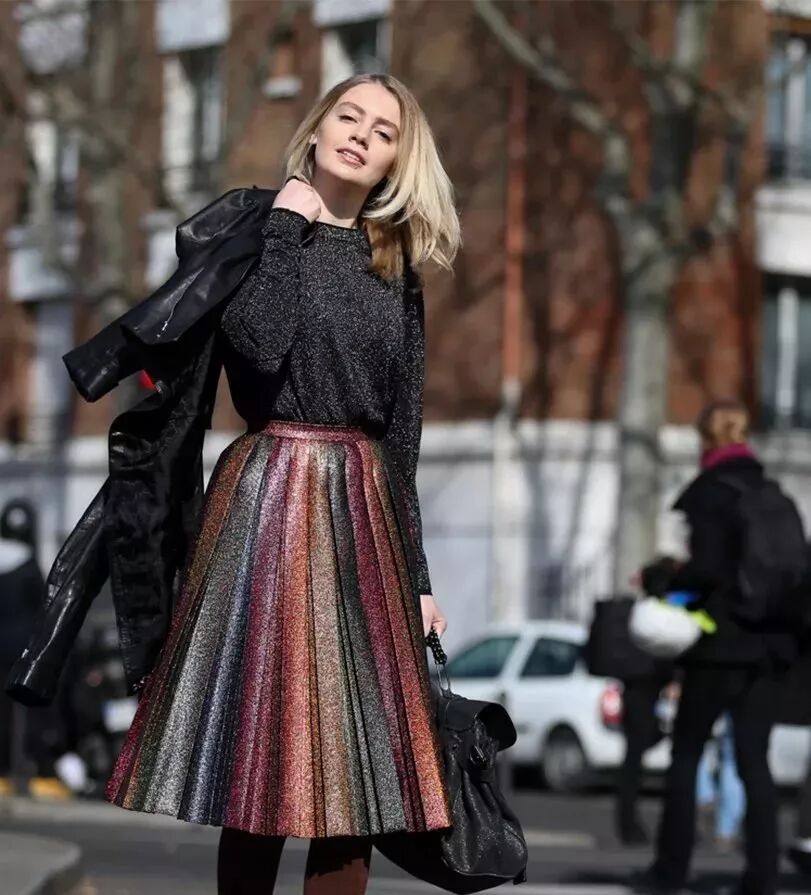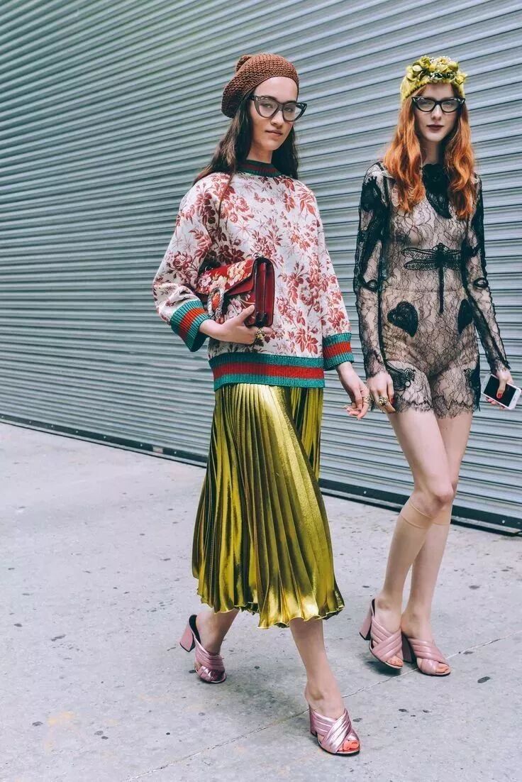 有点抓马和浮夸的金属色百褶裙,搭配温柔的毛衣,一下就起到了“降噪“作用。