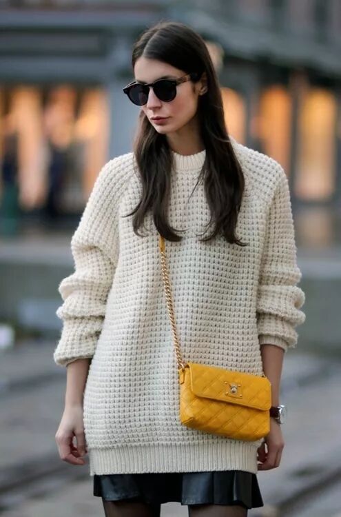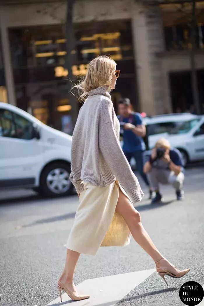 宽宽松松的OVERSIZE毛衣,搭配开叉包臀裙,每年秋季时装精都会翻拍这一组搭配。