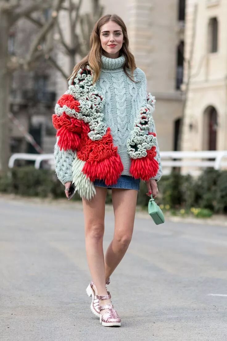 “宇博”ChiaraFerragni这件夸张的OVERSIZE毛衣,一般人不敢尝试吧,露出的牛仔裙裙边,加上粉色的鞋子,是少女了。