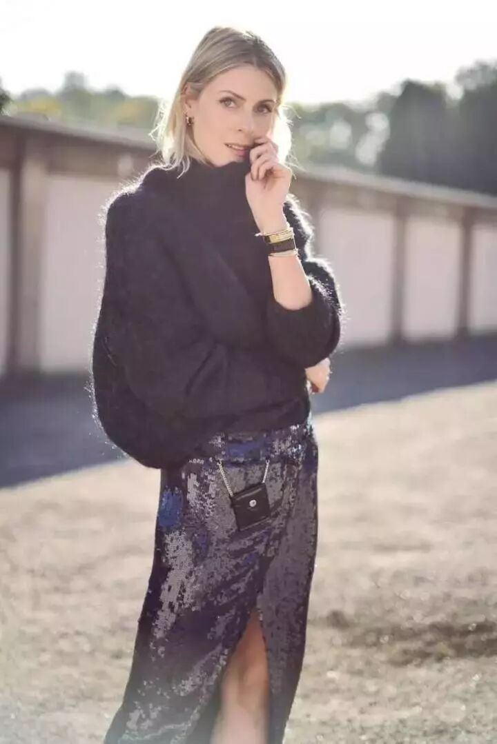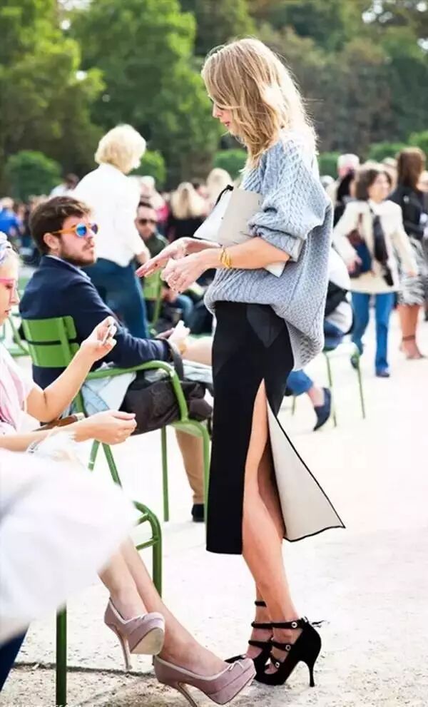 毛衣和开叉包臀裙搭配时,建议以“上松下紧“的款式搭配,更显瘦拔高,也不容易暴露身材缺陷。