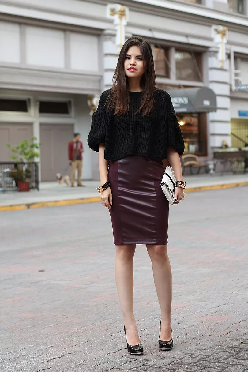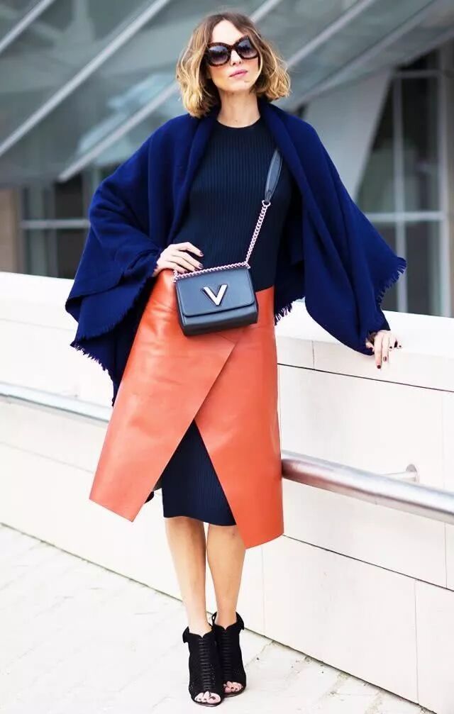 关于皮裙的选择,更推荐简洁的包臀裙和A字型的款式,色彩也不需要局限黑色,比如酒红也很好搭,很女人味儿。