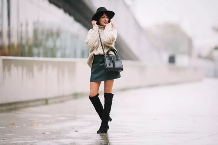 基础款的A字皮裙,搭配OVERSIZE的毛衣时,建议将前衣角塞一部分到裙子里,让腰线更明显,拉长下身比例,营造大长腿视效。
