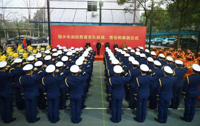 今天上午9点,丽水消防迎来历史性时刻——丽水市消防救援支队隆重举行迎旗、授衔和换装仪式。