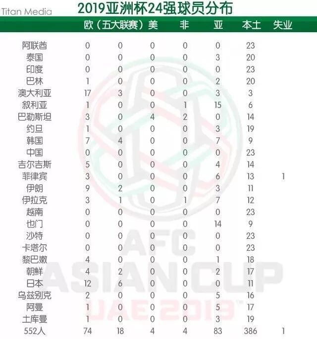 参加本届亚洲杯赛的24支队伍的所有552名球员,分布于世界足坛的各个角落。
