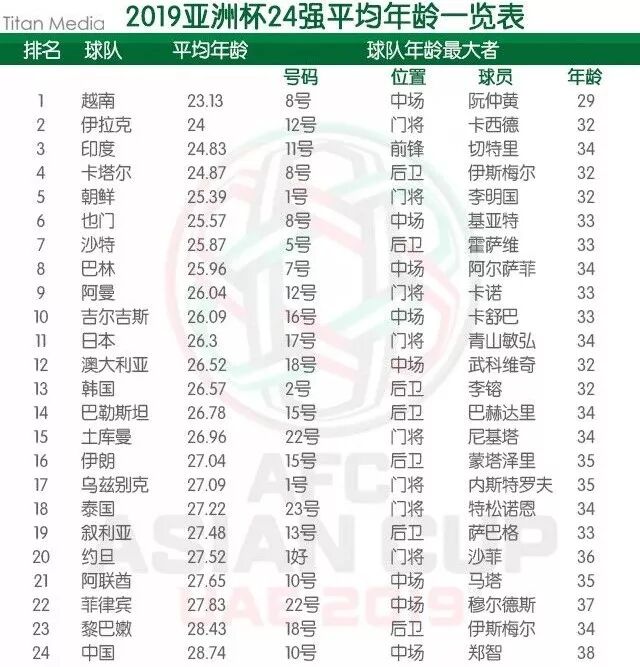 本届亚洲杯,中国队参赛名单一公布,就被国内媒体诟病为“老龄化”国足。如今,亚足协已经正式公布了各参赛队球员名单,果然不出意料,中国队成为了24强中平均年龄最大的队伍,全队23人的平均年龄为28.74岁。而且,中国队队长郑智还成为了本届亚洲杯赛上年龄最大的球员。(注:球员年龄以2019年1月5日亚洲杯赛开幕为界展开计算。)