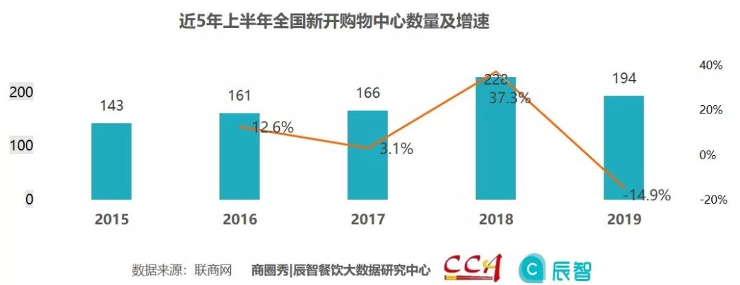 数据显示,2018年,商业中心数量猛增,2019年上半年我国新开购物中心仍保持上涨趋势,但增速有所放缓。