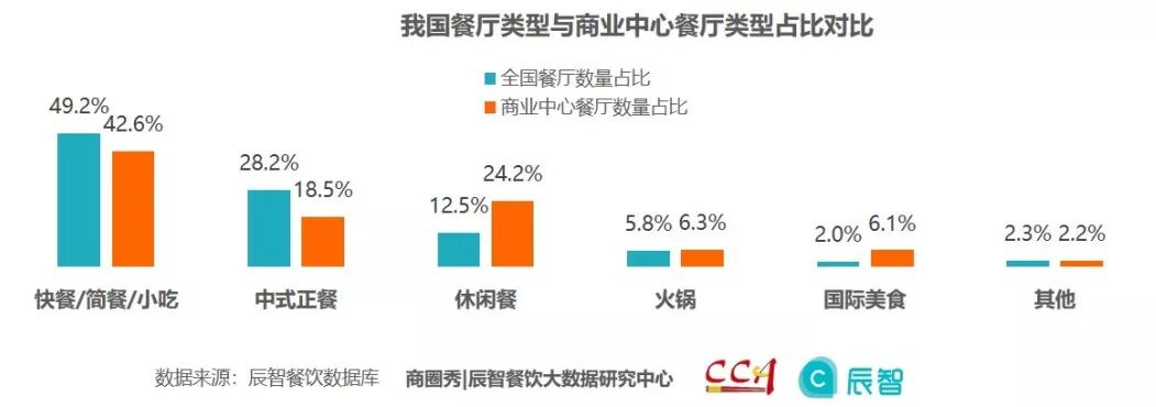 报告数据显示,在商业中心餐饮中,快餐/简餐餐厅的占比已经超过中式正餐的一倍。