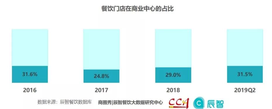 数据显示,餐饮门店在商业中心的占比从2016年到2019年基本维持在30%左右,对于口碑好,品牌质量过关的企业,进入购物中心仍然是其实现品牌升级较好的途径。