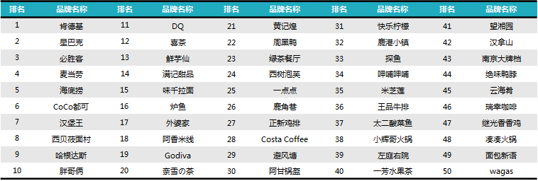 肯德基、星巴克、必胜客、麦当劳、海底捞、CoCo都可、汉堡王、西贝莜面村、哈根达斯、胖哥俩、DQ、喜茶、鲜芋仙、满记甜品、味千拉面、鲈鱼、外婆家、阿香米线、Godiva、奈雪の茶、黄记煌、周黑鸭、绿茶餐厅、西树泡芙、一点点、鹿角巷、正新鸡排、Costa Coffee、避风塘、阿甘锅盔、快乐柠檬、鹿港小镇、探鱼、呷哺呷哺、米芝莲、王品牛排、太二酸菜鱼、小辉哥火锅、左庭右院、一芳水果茶、望湘园、汉拿山、南京大牌档、绝味鸭脖、云海肴、瑞幸咖啡、继光香香鸡、凑凑火锅、面包新语Wagas也在列商业中心餐饮品牌Top50。
