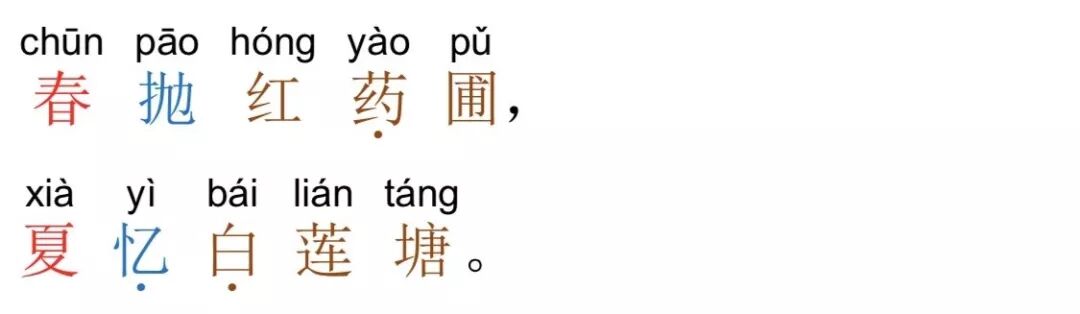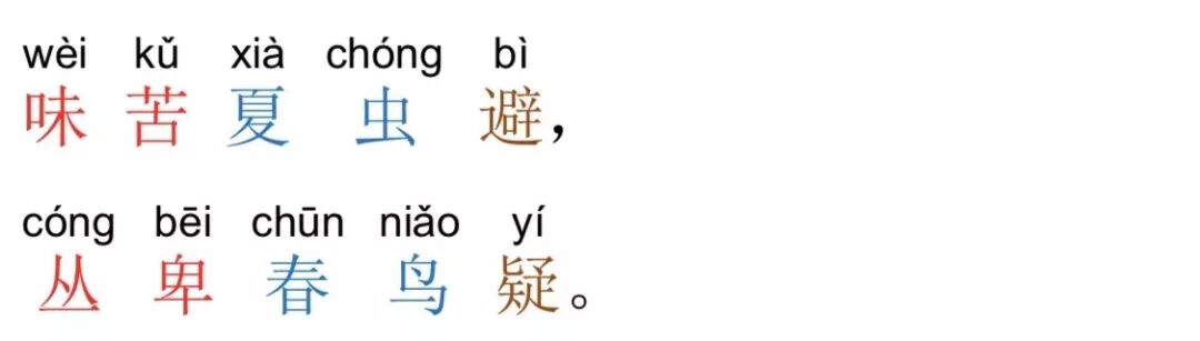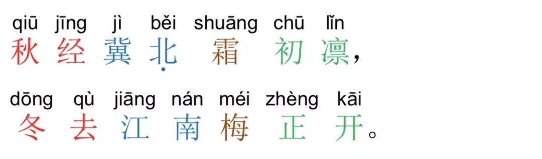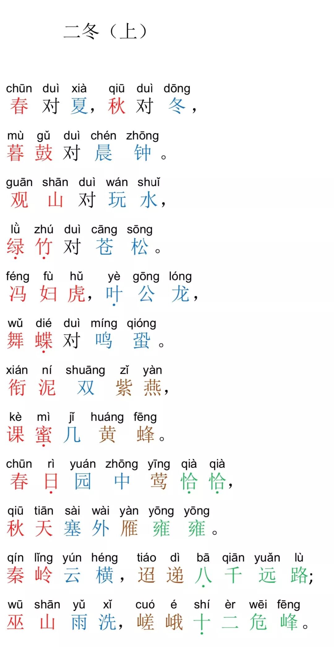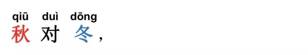 注:在四季中,春、秋、冬皆为平声字,夏是仄声字,因此,春 对夏是合律的,秋对冬却是不合律的。春、秋、冬三字皆可与夏相对, 而春、秋、冬三字之间却不可相对。与此类似的还有四方,东、南、 西皆为平声字,北是仄声字,故东、南、西三字皆可与北相对,而东、 南、西三字之间却不可相对。如果非要对仗,也应按照“一三五不论, 二四六分明”的原则,尽量避免将这些同为平声的字放在偶数位。秋 对冬,是整本《声律启蒙》唯一一处不合律的对仗,虽然我们按照惯 例列举了相应的诗句,但读者在自己写作对联时还是要注意避免这种情况的发生。