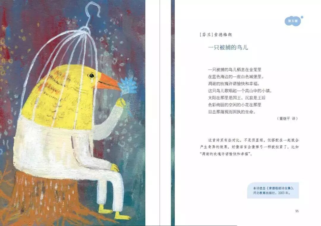 每首诗歌,编者都为孩子们做了精炼而深长的诗歌解析,导语不拘泥诗歌的具体含义,一开放的姿态,让孩子们在阅读中体味到诗歌的魅力。
