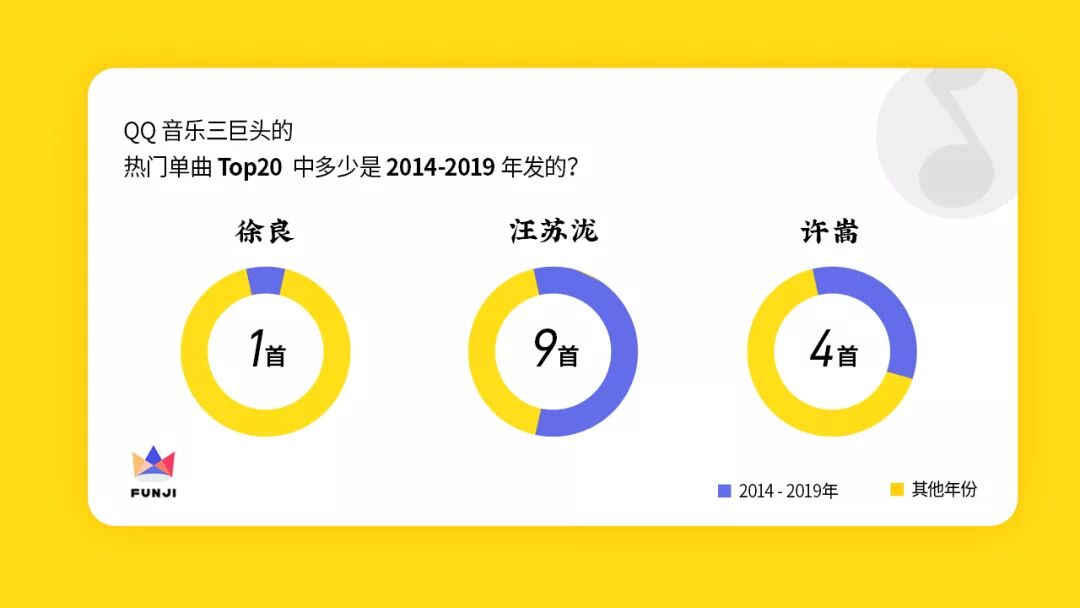 我们最@不近人情的数据杀手又点开了现在的QQ音乐现状:2014-2019年,徐良热度前20的音乐里,只产出了1首,许嵩也只产出了4首,而汪苏泷有9首。