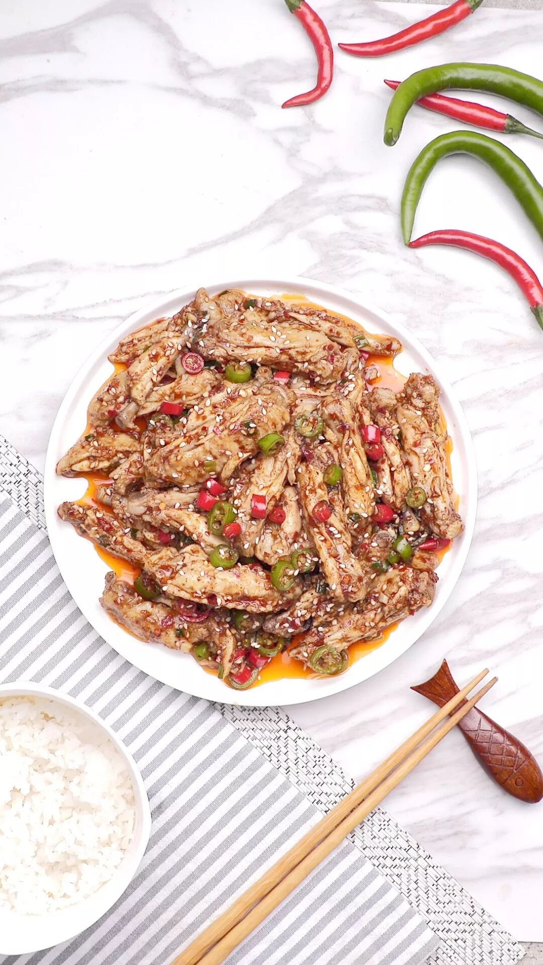 4 | 往盛有鸡翅的碗中加入青椒、朝天椒、花椒粉、盐、醋、白糖,生抽、芝麻、和刚刚做好的红油,抓拌均匀,放入冰箱冷藏20分钟,就会变得超级好吃。