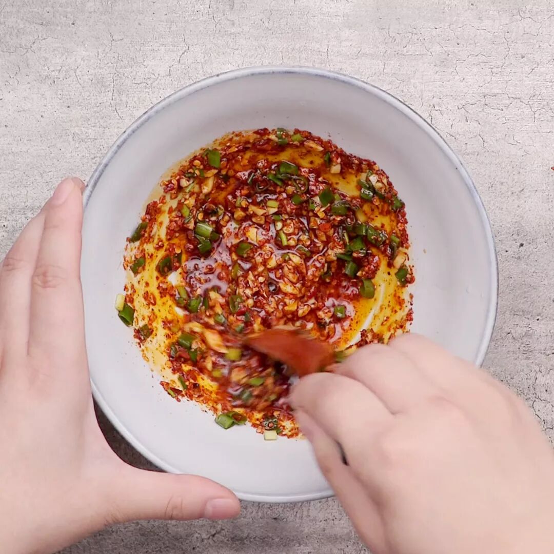 3 | 麻辣酱汁制作:碗中依次放入蒜末、葱花、辣椒粉,浇一大勺热油,搅拌均匀,做成红油。
