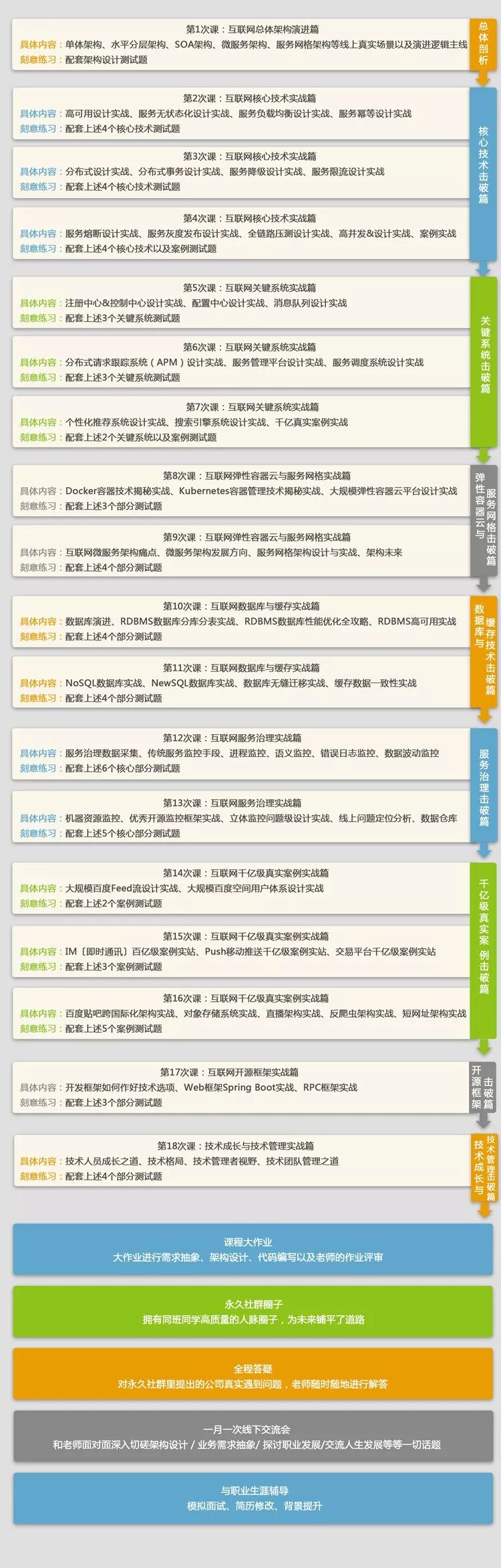 3. 内容注重架构设计体系建设,形成立体化架构设计结构:目前很多架构培训,往往过分关注每个具体的技术知识点,但是无法把这些静态的技术知识点连接起来形成立体化的架构设计体系。百万架构需要交付给同学就是立体化的架构设计体系,从而真正掌握架构设计哲学,建立一个较为完备的架构设计脉络,从而才能在一波一波的技术革新中立于不败之地。
