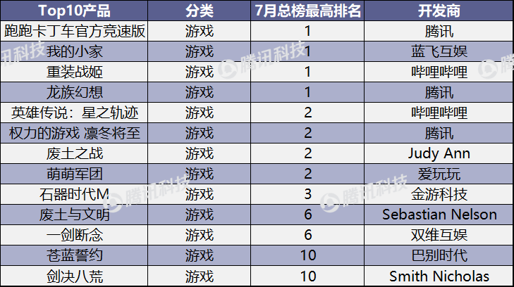 · 总榜Top 10:腾讯新游戏成7月“黑马”产品
