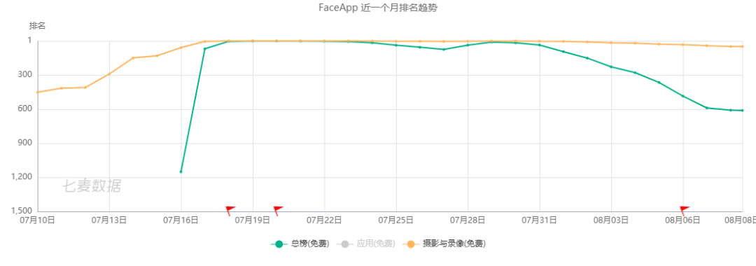 七麦数据显示,已经上线两年、来自俄罗斯的“老产品”FaceApp,7月份在中国再度爆火,一度登至总榜第5名。