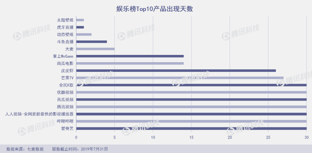 7月份,共16款产品出现在娱乐榜Top 10,爱奇艺、腾讯视频、优酷视频、人人影视和西瓜视频5款产品占据娱乐榜第1名。