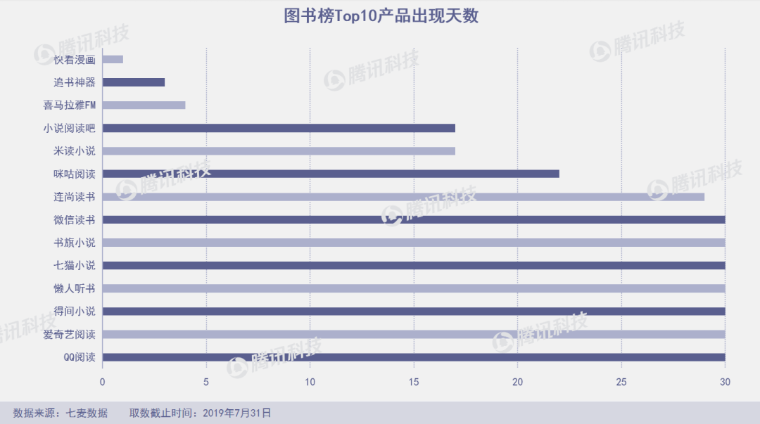 14款产品占据7月图书榜Top 10,米读小说、得间小说、七猫小说、喜马拉雅FM和爱奇艺阅读5款产品霸榜图书榜。