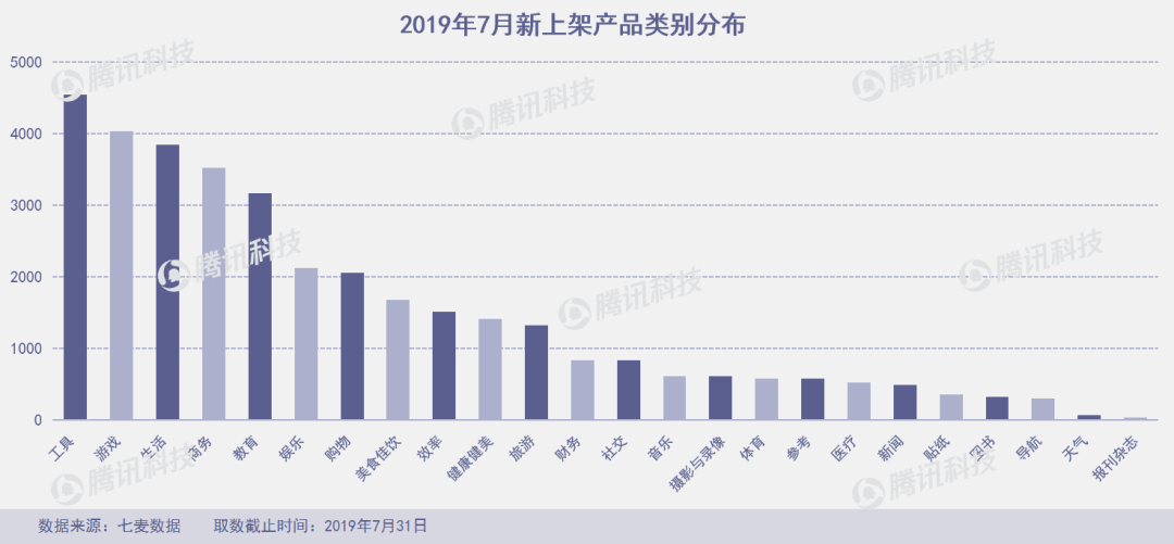 其余数量较多的依次为游戏类、生活类、商务类和教育类,新产品数量均超过3000款。