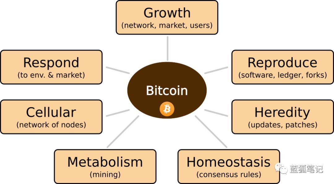 比特币涉及到了生物体的所有特征:生长、繁殖、继承和传递特征,使用能量来维持稳定的内部结构,本质上是细胞,并对它生活的各种环境因素作出反应。