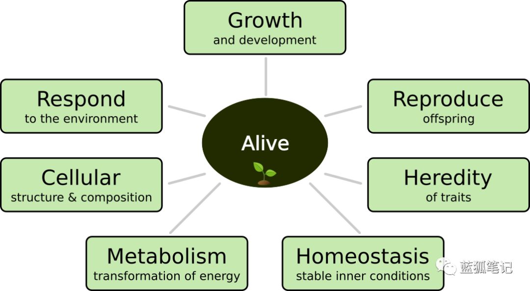 我们可以尝试通过观察活着的事物来描述这个过程,并观察它们的行为:它们生长、繁殖和反应; 它们继承了特征,由更小的单元(细胞)组成,并利用能量在熵增状态中保持其内部结构。