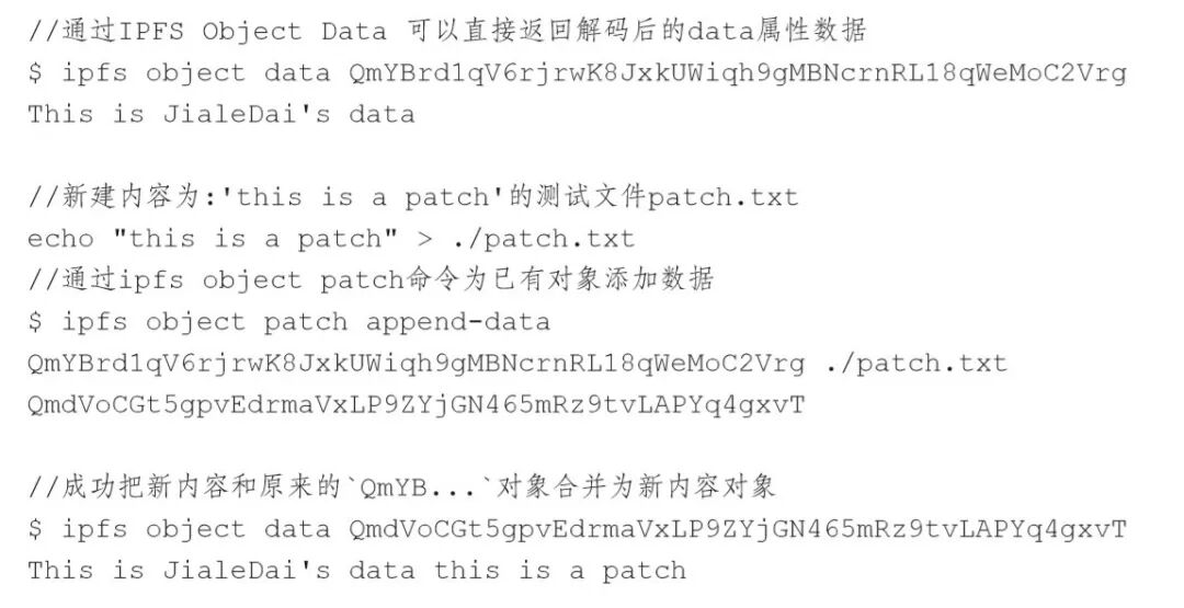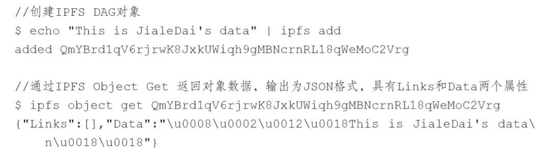 在c小节介绍了IPFS对象的定义。如下所示,我们可以通过ipfs object命令来直接操作DAG对象,以实现块数据和对象的信息查询、修改添加等效果。