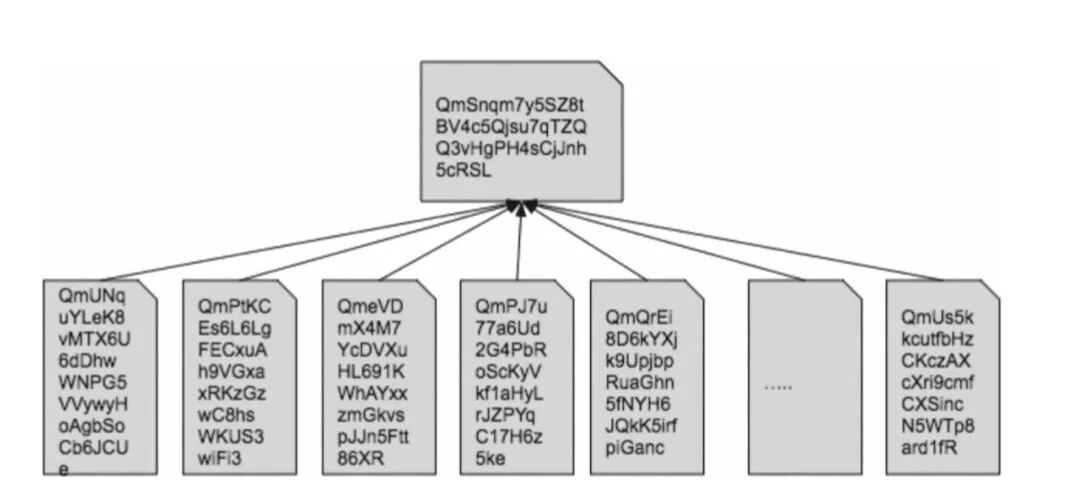 如下图所示,与文件merkle-tree-demo.jpg对应的内容哈希QmUNqu是DAG结构中根块的哈希包含了4个子块,子块和根块形成了一种树状结构,且同时具有Merkle Tree和DAG结构的特性,因此被称为Merkle DAG。