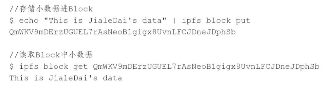 当我们在处理一些小数据的时候,可以不必通过ipfs add文件切片的形式,而是直接操作IPFS块结构来进行数据的添加。尤其在处理海量小文件的场景需求下,可以显著提高处理效率,如下所示: