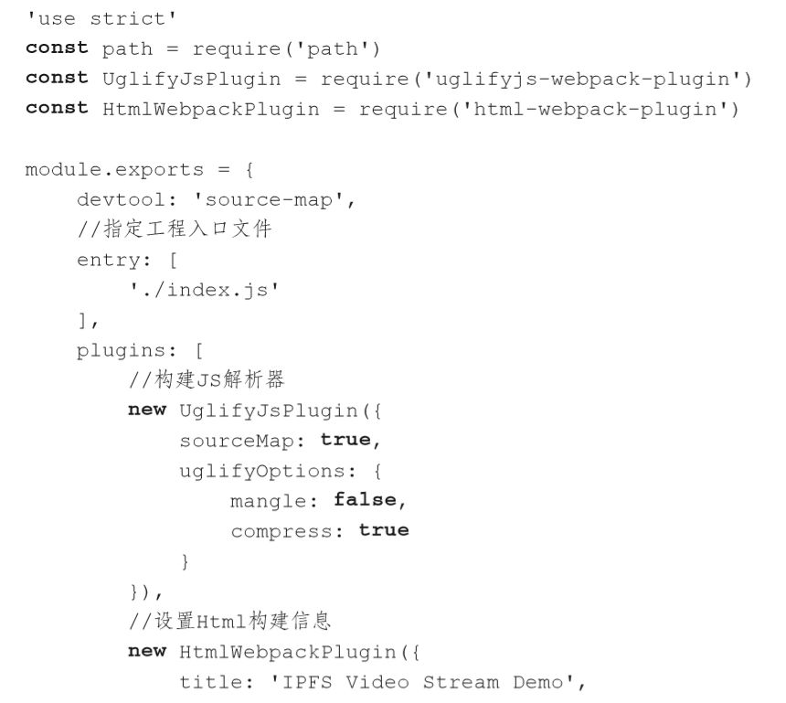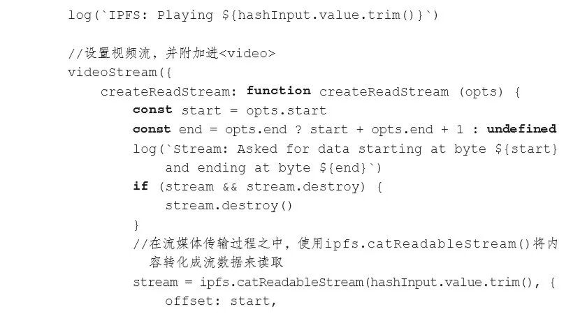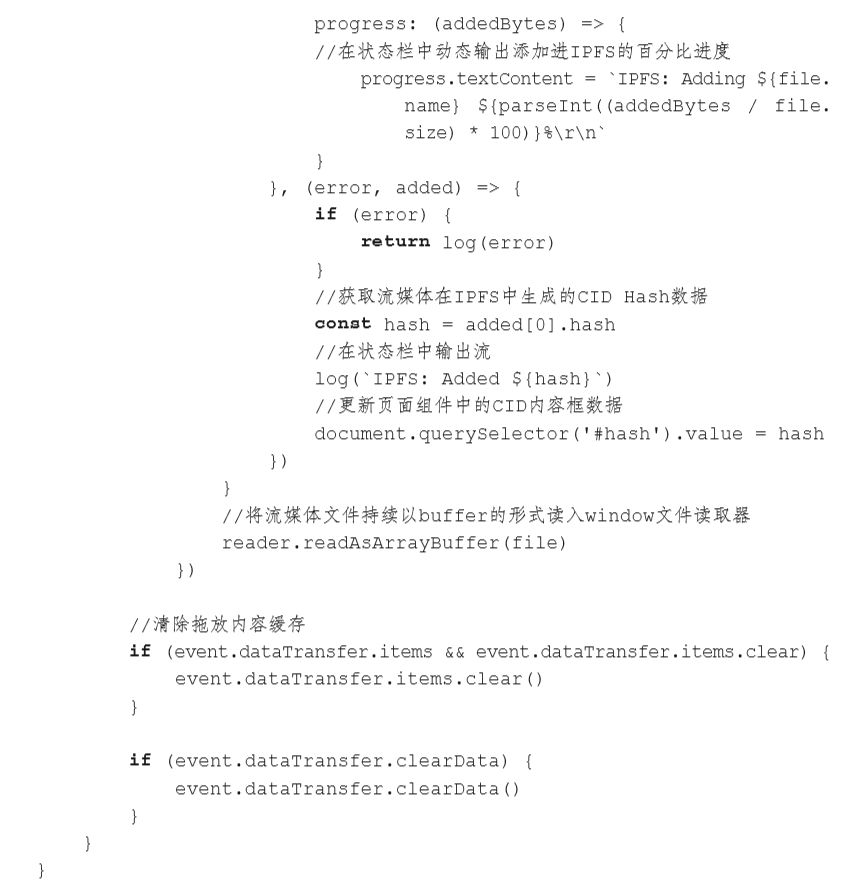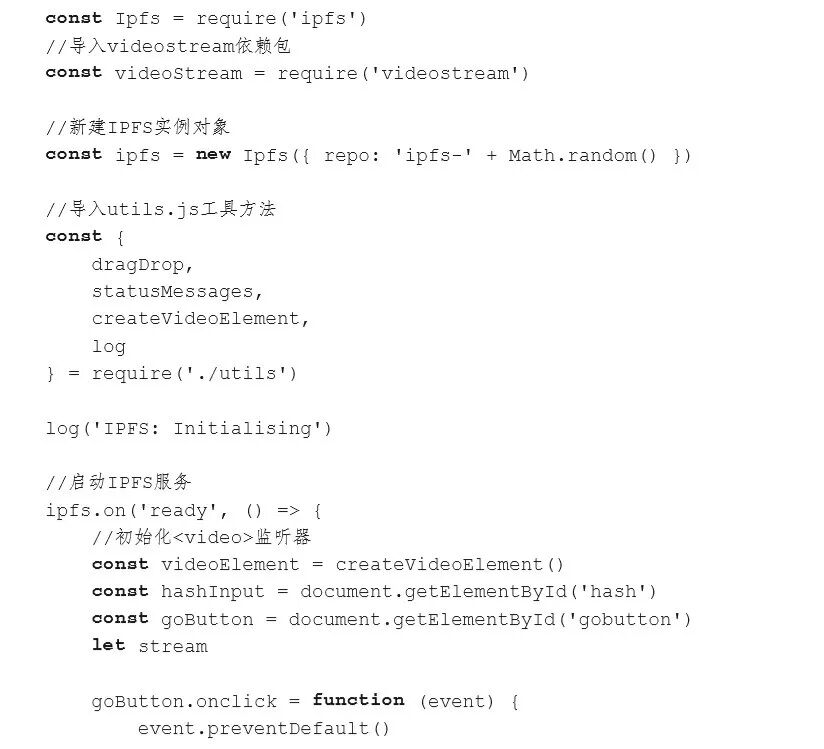在index.js中定义全局业务流程,职能是初始化IPFS服务,初始化拖放方法,并设置从IPFS中读取流媒体至浏览器播放器的按钮事件。