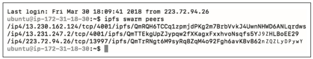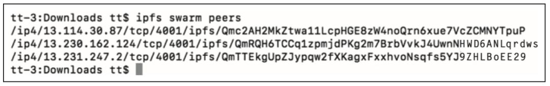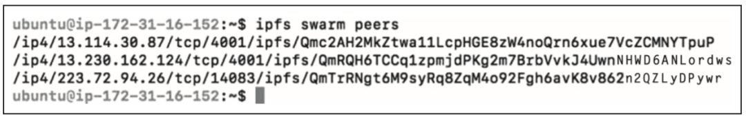 ipfs pubsub peers:列出与本节点相连接的开通pubsub功能的节点。
