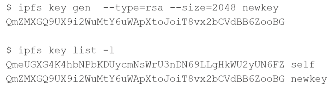 是节点ID。如果我们要用新的Key公钥绑定文件内容,就需要使用ipfs key gen创建新的RSA公钥。