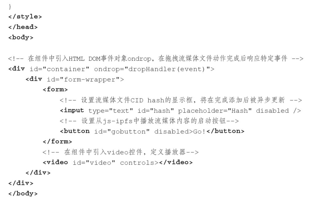 至此,我们已经编写了好了id值为container、支持拖拽上传媒体文件的块元素容器,并在块元素容器中引入了id值为gobutton的播放响应按钮、承载CID信息输入的元素及承载视频媒体的