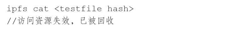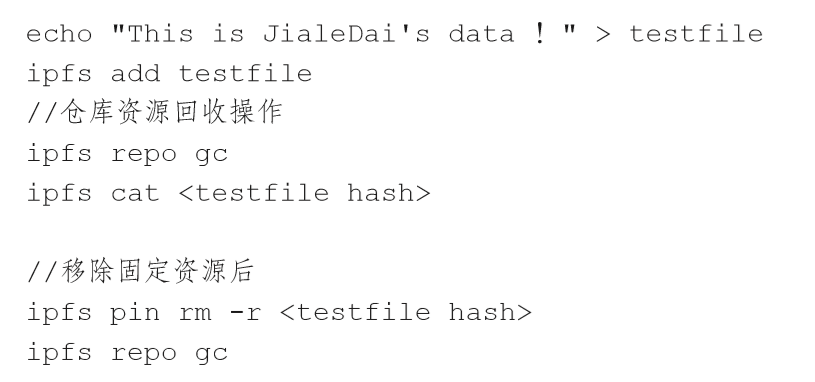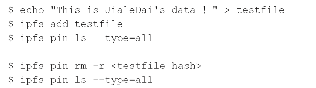 固定操作机制具有添加、查询、删除等功能,我们可以通过ipfs pin ls、ipfs pin rm、ipfs pin ls等具体命令来操作。如下所示,我们通过新建了一个testfile本地资源,并加入IPFS网络,使用ipfs pin ls验证固定资源的存在性,并通过ipfs pin rm -r递归删除固定资源。