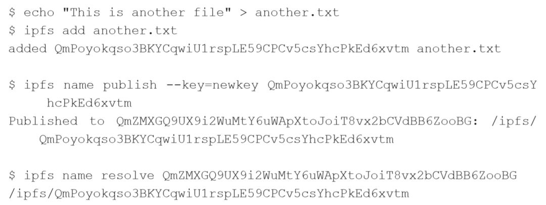 3.7节曾介绍过IPFS命名层的设计原理,也介绍了一种能在易变环境中保持固定命名的方案—星际文件命名系统(IPNS),它允许节点ID为限定的命名空间提供一个指向具体IPFS文件或目录的指针,通过改变这个指针,每次都指向最新的文件内容,可以使所有查询请求始终访问最新的内容。